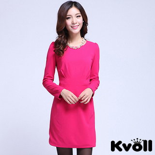 【KVOLL大尺碼】玫紅色圓領修身氣質連衣裙