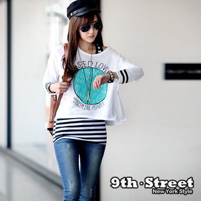 【9th.Street】女星魅力.條紋拼袖地球印圖上衣