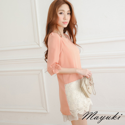 東京著衣-MAYUKI 花蕾絲拼接長版雪紡上衣-S.M(共二色)