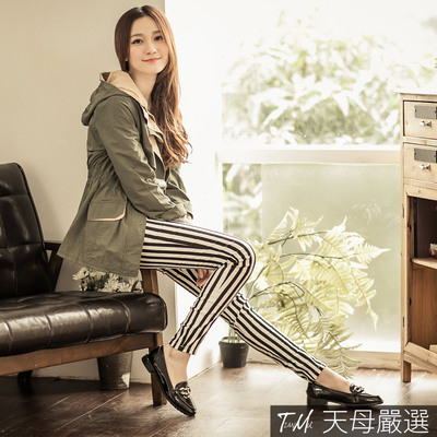 【天母嚴選】纖細修飾‧螢光褲頭花色彈力窄管褲(黑底白條)