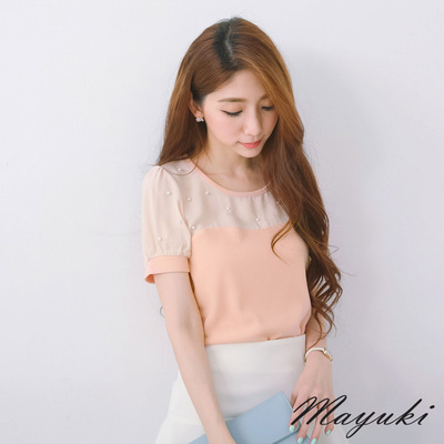 東京著衣-MAYUKI 綴珠雪紡拼接壓皺上衣-S.M(共二色)