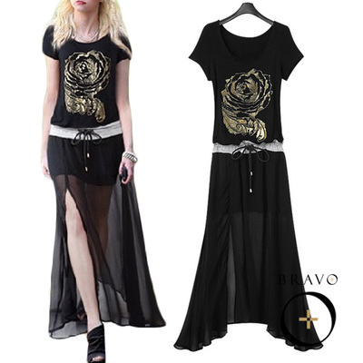 莫代爾燙金玫瑰印花拼接雪紡透視開岔洋裝 Bravo
