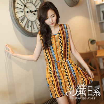 幾何圖騰抽繩背心洋裝(圖騰橘)-沙織日系