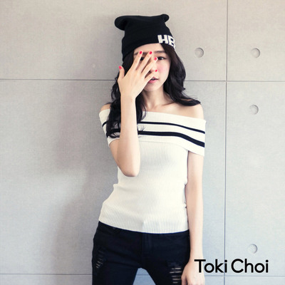 東京著衣 黑白條紋一字翻領針織上衣-S.M(共二色)-4018447