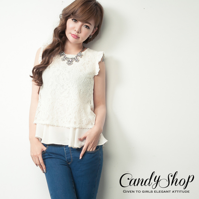 CANDY小舖 正韓國小荷葉袖口蕾絲兩層雪紡紗背心