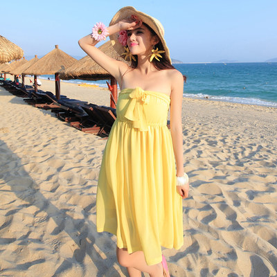 波西米亞裹胸收腰露肩吊帶掛脖雪紡洋裝(黃色)-Joli-neon商品網址: