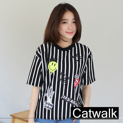 條紋笑臉英文多圖棒球T恤(黑)-Catwalk