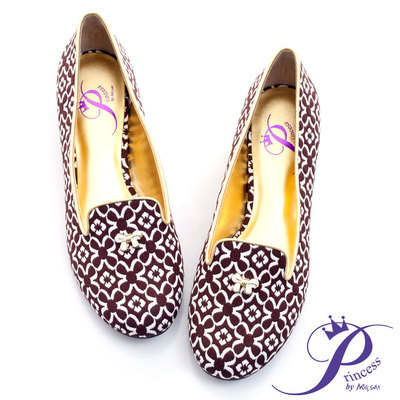 Princess-華麗印象-繡花印漾金屬蝴蝶結樂福鞋~復古咖