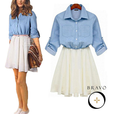兩件式視覺牛津襯衫拼接雪紡圓裙洋裝 Bravo商品網址: