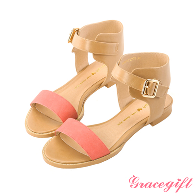 Grace gift復古玩色.簡約寬版踝帶撞色涼鞋 粉