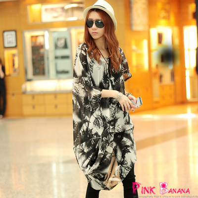 水墨羽毛不規折剪裁雪紡洋裝-Pink Banana