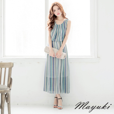東京著衣-MAYUKI 幾何圖騰無袖雪紡長洋裝-S.M(共二色)