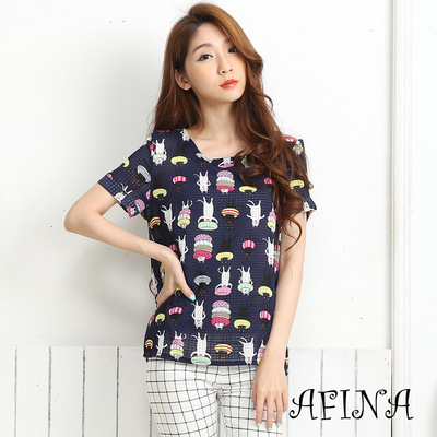 印花圖案雪紡上衣-甜甜圈貓黑 AFINA