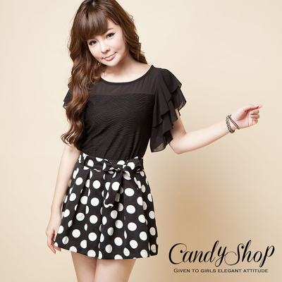 CANDY小舖 圓領雪紡多荷葉袖素面波紋上衣(黑色)商品網址: