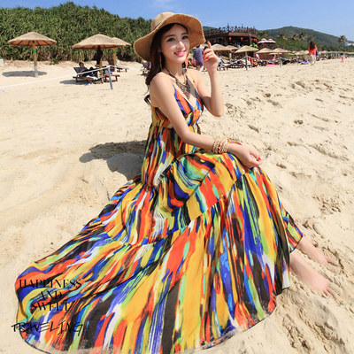 性感V領波西米亞碎花雪紡長款拖地吊帶長裙(炫彩色)-Joli-neon