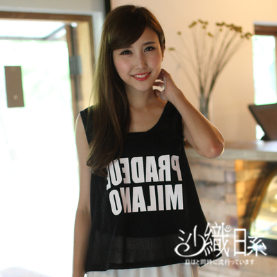 膠印反字母透膚感亮粉網紗寬版背心(黑)-沙織日系