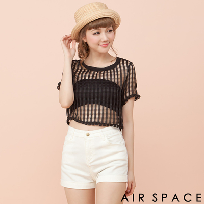 AIR SPACE 鏤空感格紋透膚短版上衣(玩酷黑)