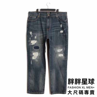胖胖星球 大尺碼‧抓破造型直筒牛仔褲