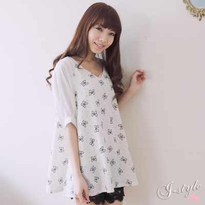 • 滿版的可愛蝴蝶結圖案~拼接浪漫泡泡袖子~而且雙V剪裁~修飾出完美好比例?