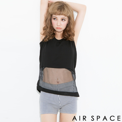 AIR SPACE 透膚薄紗衣襬雪紡無袖背心上衣(成熟黑)