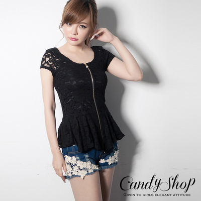 CANDY小舖 珍珠拉鍊開襟圓領蕾絲傘擺上衣(黑色)