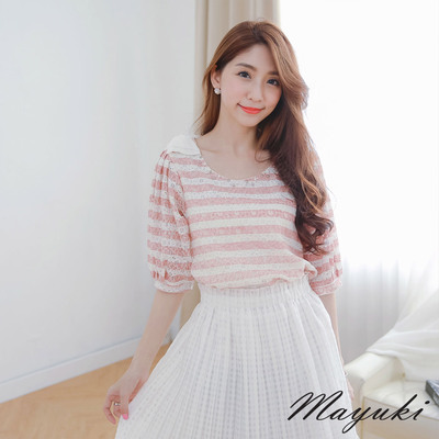東京著衣-MAYUKI 釘珠蝴蝶結條紋蕾絲上衣-S.M(共二色)