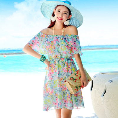 荷葉邊一字領鬆緊碎花洋裝(藍色)-Joli-neon