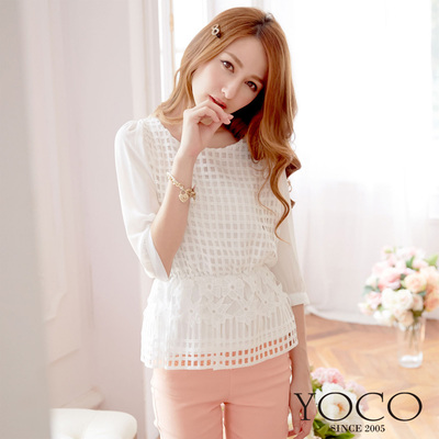 東京著衣-YOCO 鏤空方格縮腰雪紡上衣-S.M.L(共一色)