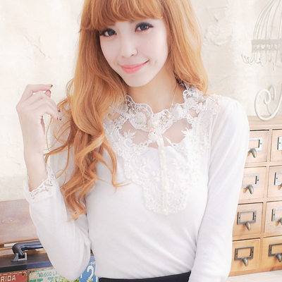 Kilei綺麗 迷人風格透膚蕾絲領綴珠牛奶絲上衣(浪漫白)
