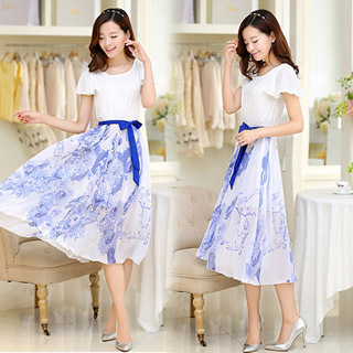 【韓國K.W.館】韓國古典.青花瓷印花雪紡洋裝(共2色)