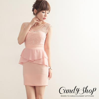 CANDY小舖 春色嫵媚蕾絲雙荷葉腰背心洋裝(淺粉)