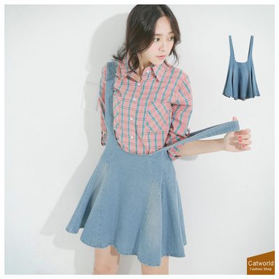 吊帶鬆緊牛仔圓裙淺藍色Catworld