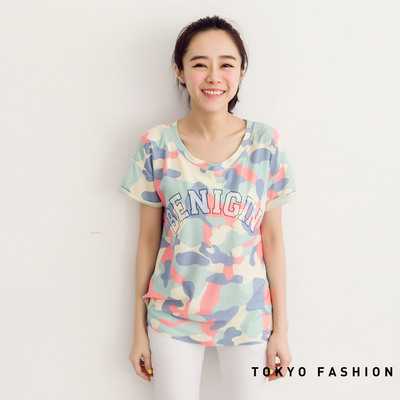 東京著衣 糖果色迷彩字母捲袖T-S.M(共二色)