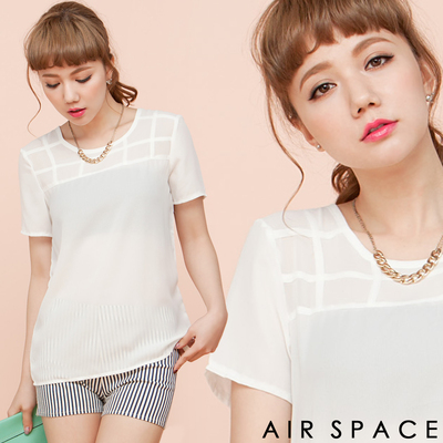 AIR SPACE 透膚格紋領短袖雪紡上衣(知性白)