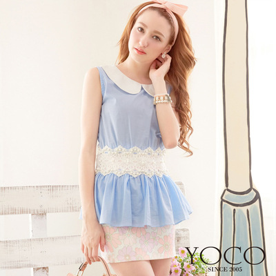 東京著衣-YOCO 娃娃領拼蕾絲傘襬背心-S.M(共二色)-4011898