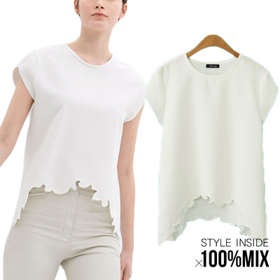剪裁波浪不規則下擺圓領上衣 共二色 100%MIX
