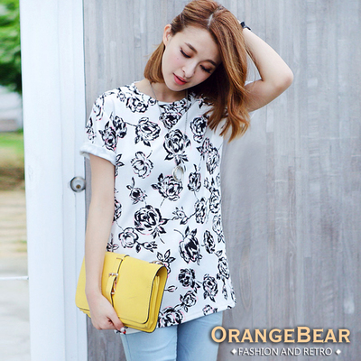 OB嚴選-黑白玫瑰花圖案圓領上衣