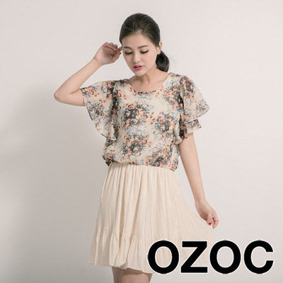 OZOC 雪紡碎花荷葉袖洋裝(共三色)