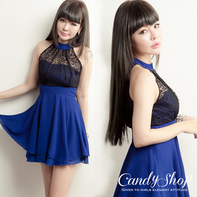 CANDY小舖 豹紋蕾絲繞頸削肩雙層雪紡洋裝(藍色)商品網址:
