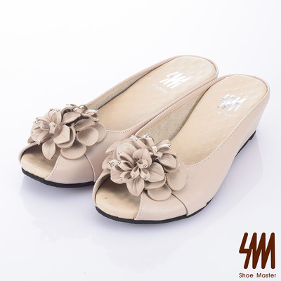 SM-臺灣製全真皮-皮革花朵露趾厚底涼鞋-卡其