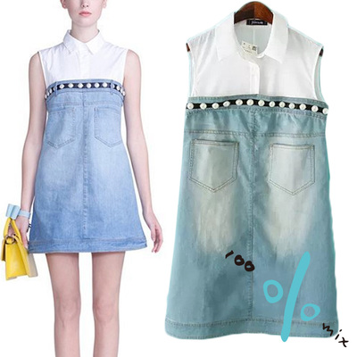 假兩件珍珠裝飾牛仔拼接洋裝 100?X