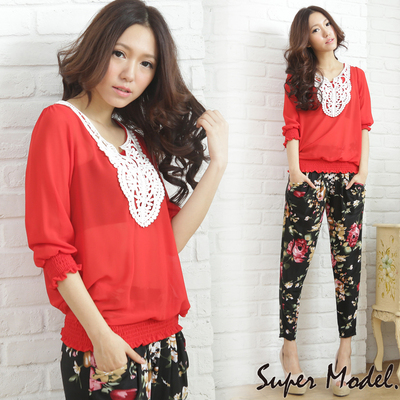 【名模衣櫃】領口布蕾絲緹花雪紡上衣-紅商品網址: