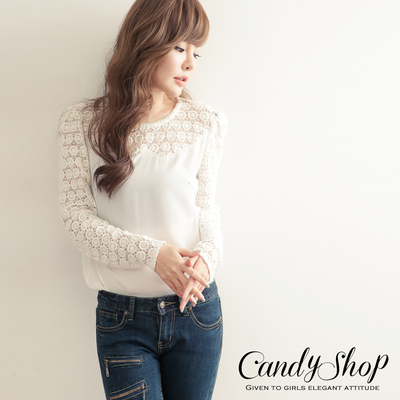 CANDY小舖 歐風珍珠領圓圈透蕾絲雪紡上衣(白色)