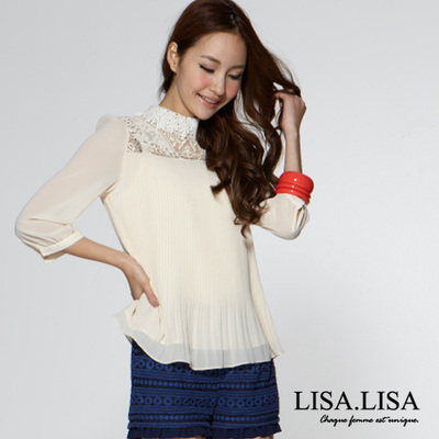 LISA.LISA宮廷感蕾絲領百摺雪紡上衣(米色)