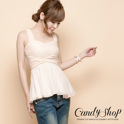CANDY小舖 胸下扭結交叉蕾絲接雪紡紗背心(米色)