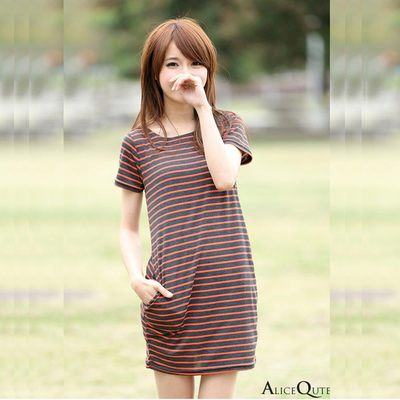 【Alice Qute】〈CCSA0156〉圓領條紋雙口袋長版上衣小洋裝.共2色