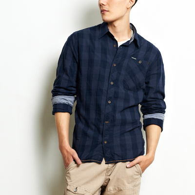 GARCIA 精緻繡線格紋大口袋基本襯衫(深藍)