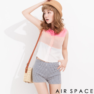 AIR SPACE 三色拼接短版無袖雪紡襯衫(甜心粉)