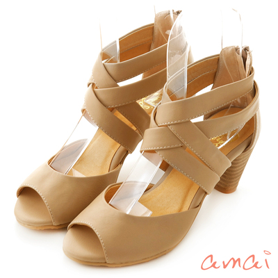 amai繞帶鏤空編織粗跟涼鞋‧後包拉鍊‧香草杏