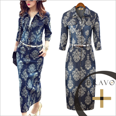 復古圖案印花七分袖牛仔洋裝 Bravo